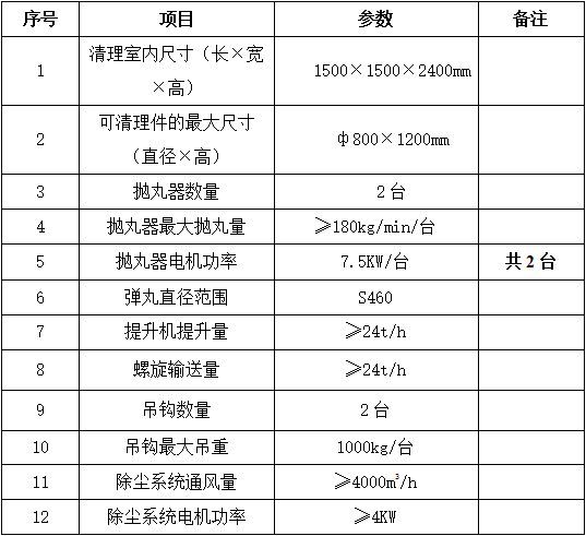 2.2功能、結(jié)構(gòu)須滿足如下要求:該設(shè)備主要由吊鉤輸送系統(tǒng)、清理室體、拋丸器、提升機(jī)、維修平臺(tái)、分離器、螺旋輸送器、底部料斗、除塵系統(tǒng)、電控系統(tǒng)等組成。
