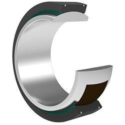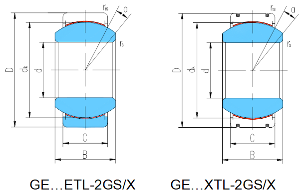產品特點:外圈有一道軸向縫,材料為不銹鋼,淬火,球面粘貼PTFE編織物;內圈材料為不銹鋼,淬火。型號后置代號為XT,表示外圈沿軸向剖分成兩半,用鎖圈固定。