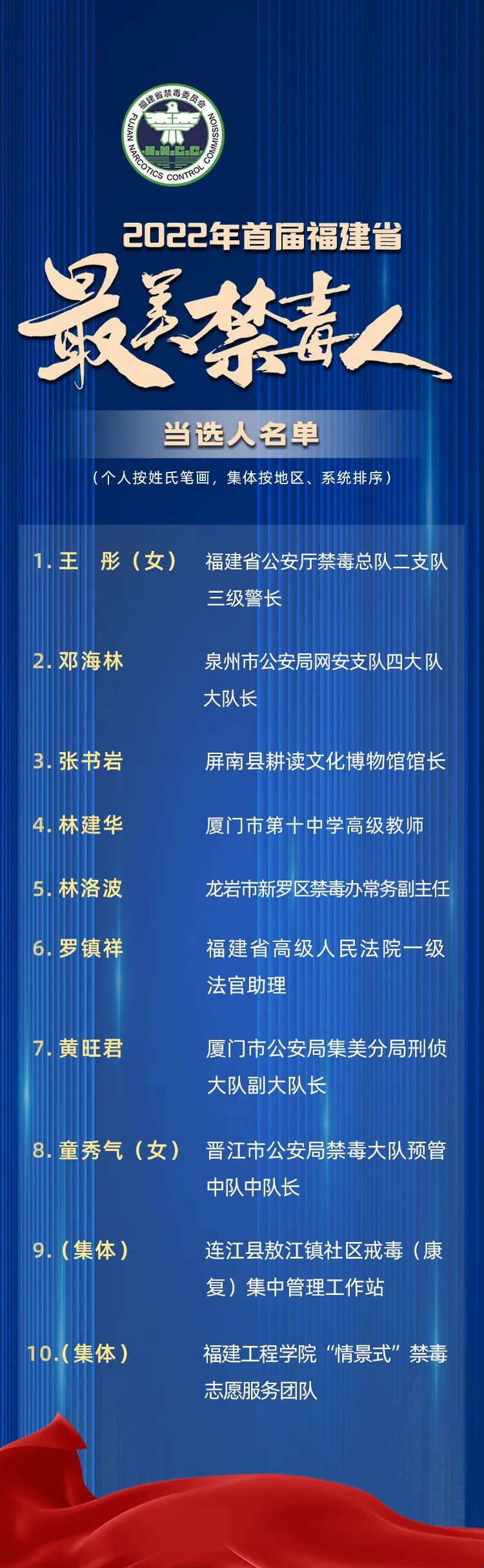 按照《關于組織開展全省首屆“最美禁毒人”宣傳推選活動的通知》要求,經基層推薦、組織初審、網絡投票、專家評審等程序,中共福建省委宣傳部、福建省禁毒委員會辦公室確定了2022年首屆福建省“最美禁毒人”10名當選人、10名提名獎獲得者最終獲評名單。現將名單予以公示,接受監督。如有異議,請在公示期限內,通過來信、來電等方式,實名反映情況。