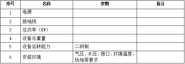3.設備其他技術指標:(需含設備總功率、電壓、電流、氣壓、水壓、接口、環(huán)境溫度、場地等安裝環(huán)境有關要求)