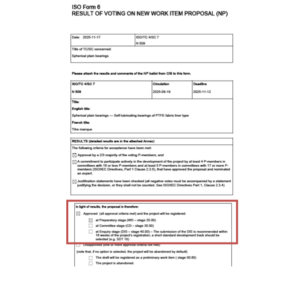 近日,由龍軸集團(tuán)主導(dǎo)的ISO/NP 25994:Spherical plain bearings-self-lubricating bearings of PTFE fabric liner type(《關(guān)節(jié)軸承 PTFE織物襯墊型自潤滑軸承》)國際標(biāo)準(zhǔn)提案,經(jīng)過ISO/TC4/SC7組織的新工作項目提案(NP)投票環(huán)節(jié),已正式獲批立項,進(jìn)入正式起草階段。這是我國牽頭立項成功的首份自潤滑軸承國際標(biāo)準(zhǔn),同時也是全球首份針對PTFE織物襯墊型自潤滑軸承的產(chǎn)品標(biāo)準(zhǔn),標(biāo)志著我國在自潤滑軸承高端技術(shù)領(lǐng)域?qū)崿F(xiàn)了從“技術(shù)跟隨”到“標(biāo)準(zhǔn)引領(lǐng)”的歷史性突破,具有里程碑的標(biāo)志性意義。