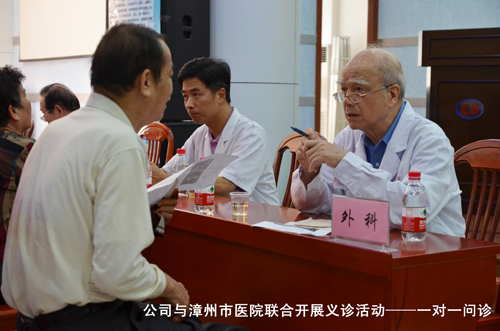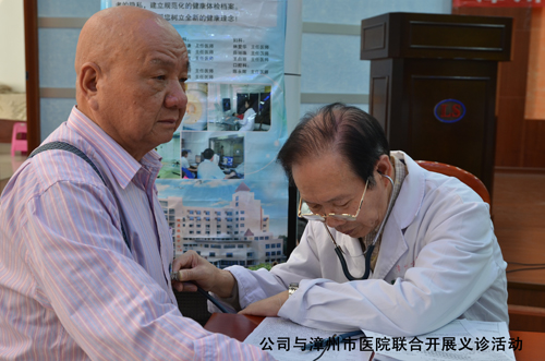 2013年3月23日下午,公司與漳州市醫院聯合舉辦學雷鋒志愿者活動,漳州市醫院體檢中心護士長郭培琴組織6名專家醫生李大新、吳召南、林華東、徐守基、方苑心、徐欽桂及8名護士到公司俱樂部開展義診活動。此次義診活動的范圍包括各科(類)疾病,如內科、外科、心胸科、眼科、骨科、血液科、腫瘤科、內分泌科、心腦血管科等,活動實行“五不”原則,即不登記、不收費、不賣藥、不推薦醫生、不推薦醫院。