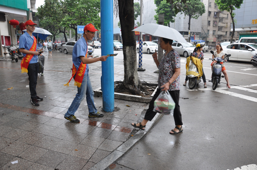 (圖a)志愿者深入到龍軸新村延安北路街頭,為過往行人分發安全生產宣傳資料。