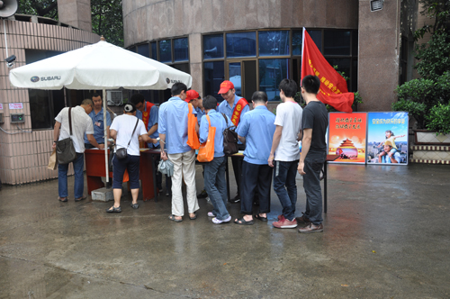 (圖b)志愿者在公司南大門,為公司員工分發安全生產宣傳資料。